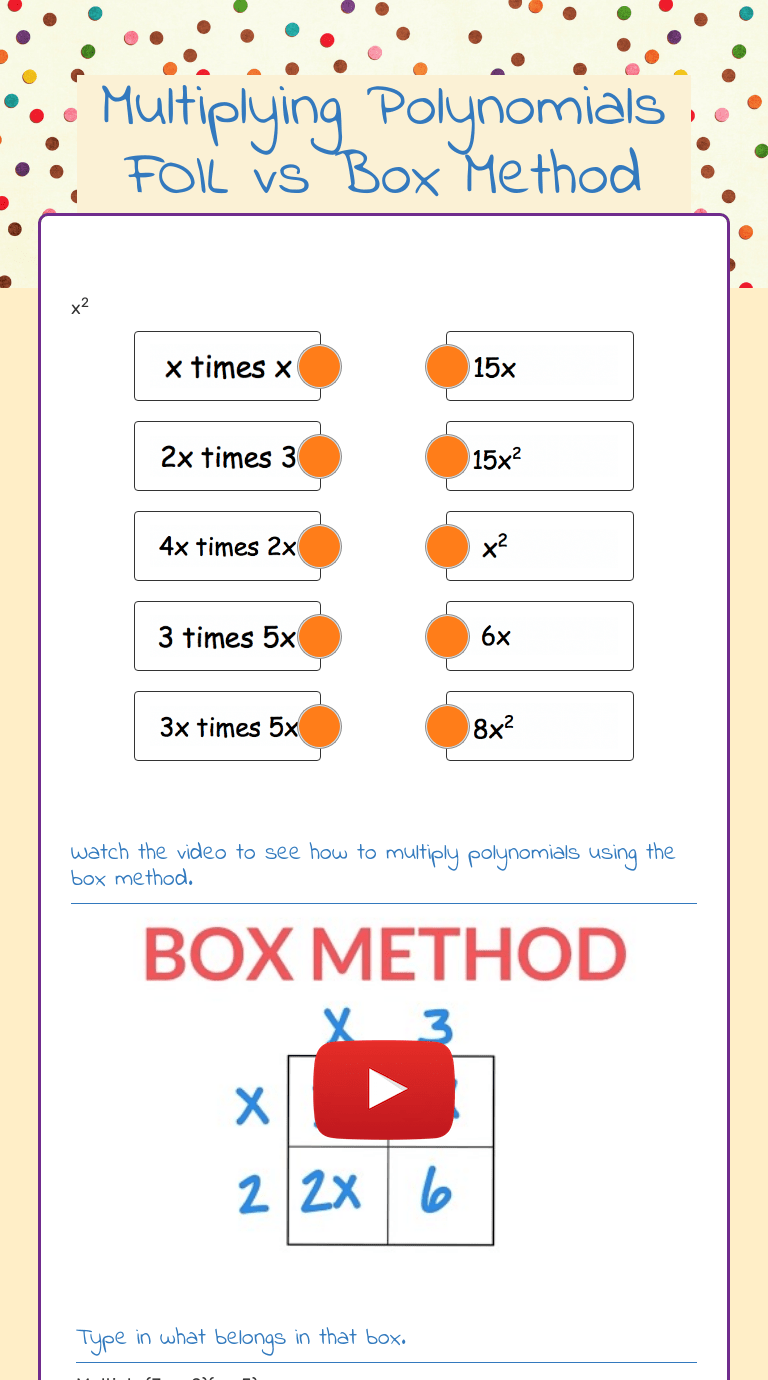 Grab this set of box method worksheets to practice polynomial multiplication using grids whose size depends on the polynomials being multiplied.